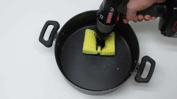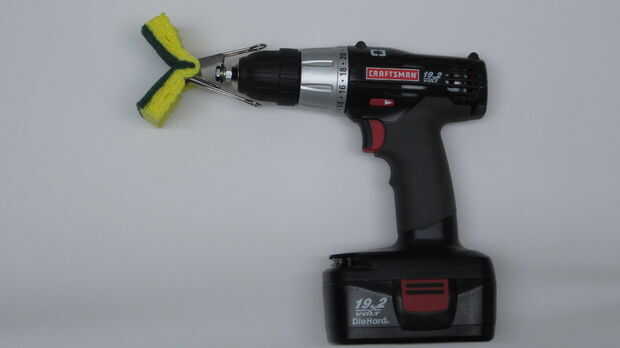 Cuando haya terminado cocina, el taladro puede incluso ayudarle a limpiar. Todo lo que necesitas es un accesorio de depurador de plato simple. Para hacer uno necesita los siguientes materiales: