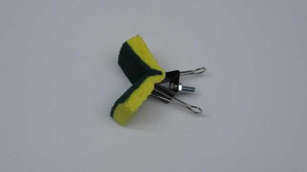 Empezar por taladrar un agujero de 1/4 de pulgada en la parte trasera de la abrazadera de la carpeta. Tratar de mantener el agujero como centrado posible. Inserte el perno a través del agujero para que los hilos de rosca del palillo de la parte trasera de la abrazadera de la carpeta. Apriete una tuerca en el perno (si desea, agregue las arandelas). Apretar una esponja en la abrazadera de la carpeta y el plato fregado accesorio es completado. Asegúrese de que no hay ningún punto donde la abrazadera de la carpeta puede estar expuesta a los platos. Esto rápidamente puede rayar y arruinar un plato. Inserte el accesorio de depurador de plato en el taladro y ya está listo para limpiar los platos con más potencia.