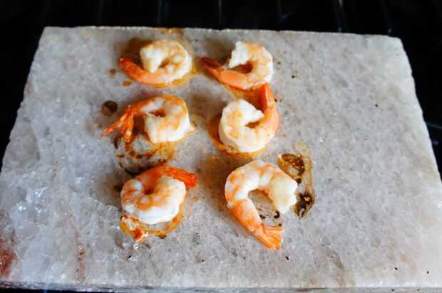 No temporada primero los camarones con sal o aceite. El bloque de sal impartirá un agradable sabor salado durante el proceso de cocción. Una vez que note un ligero color rosado, voltear los camarones encima y cocinar 1-2 minutos.