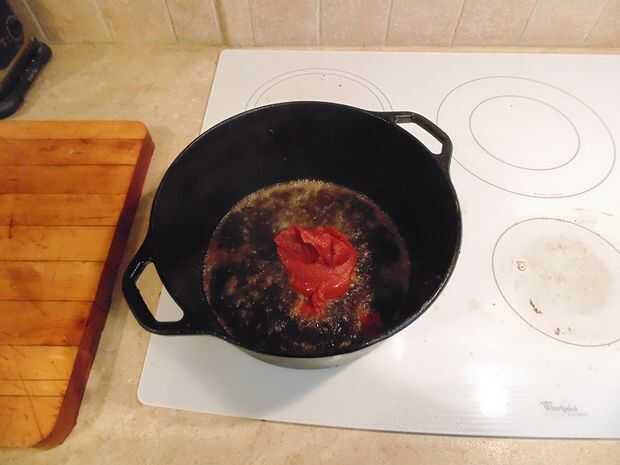 Vamos a cocinar abajo la pasta de tomate, revolviendo constantemente. Este paso es importante, porque cocinar abajo quita la amargura agria de la pasta.