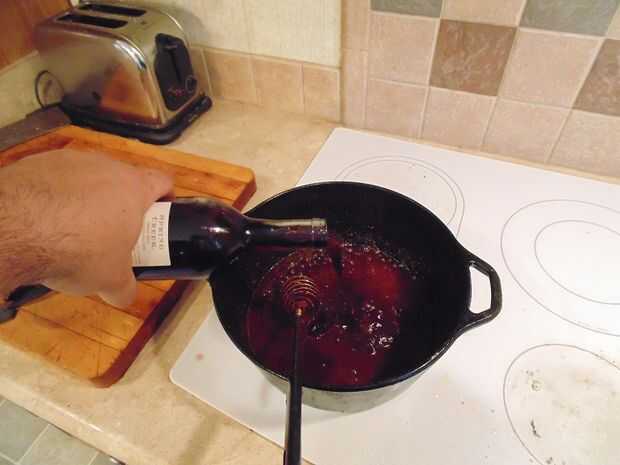 A continuación, agregue 1/2 de la botella de vino tinto a la pasta y seguir revolviendo.