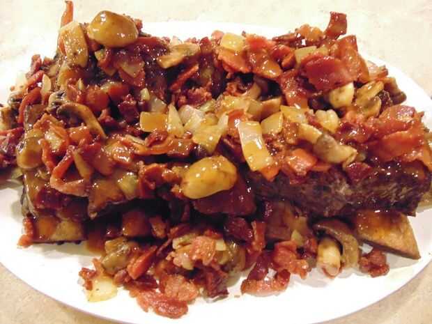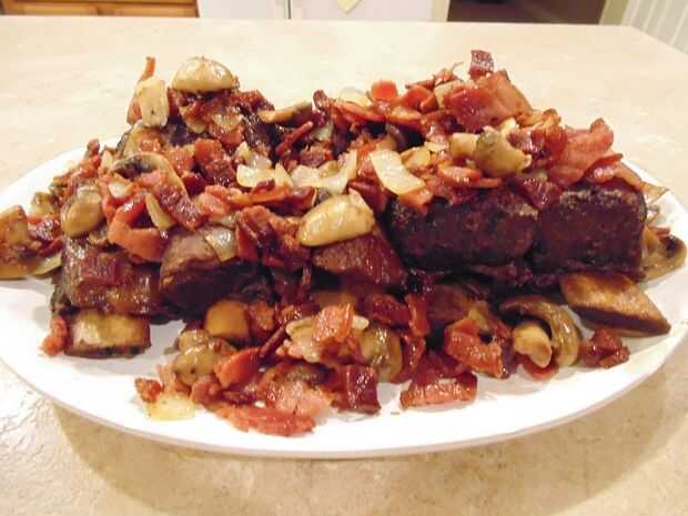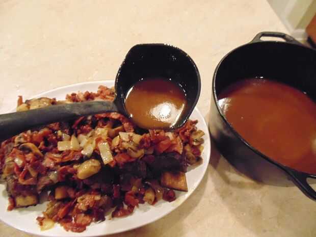 Cuchara de la cebolla, champiñones y tocino sobre la parte superior de las costillas. Parece mucho, pero el sabor y textura diferente es simplemente increíble!