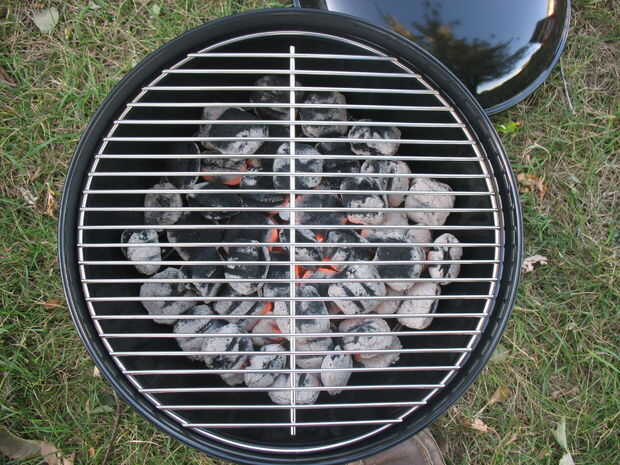 Cuando la mayoría de los carbones que empezar negro blanca alrededor del borde, caer de la pirámide con la espátula o pinzas entonces intenta repartirlos equitativamente a lo largo de la parrilla. Luego coloque en la rejilla superior por dos razones uno para limpiarlo si está sucio y también para calentar para arriba. Después de que la mayoría de los carbones se tornan blanca y se parece a la llama desaparece entonces es tiempo para cocinar.