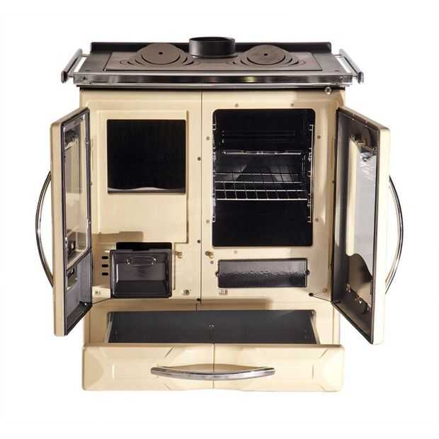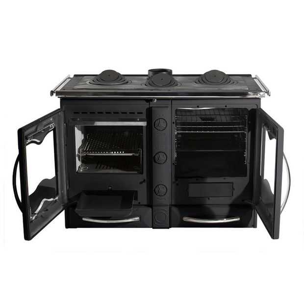 A la derecha de la cámara de combustión es el horno de la hornada. Generalmente tiene un estante en el medio para darle una superficie extra para otra bandeja de maceta o galleta. Muchas estufas tienen una cámara de calor directamente debajo de él - esto es sólo para mantener los alimentos calientes, no tan calientes como el horno y la encimera. Si tu estufa tiene una gaveta puede utilizarlo para ollas y sartenes, madera y también mantener su comida caliente.