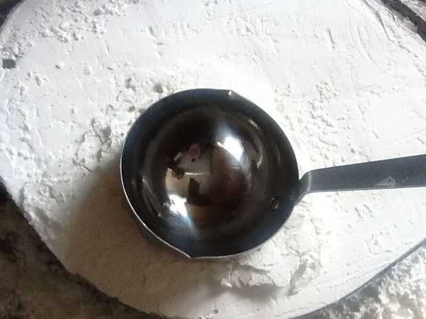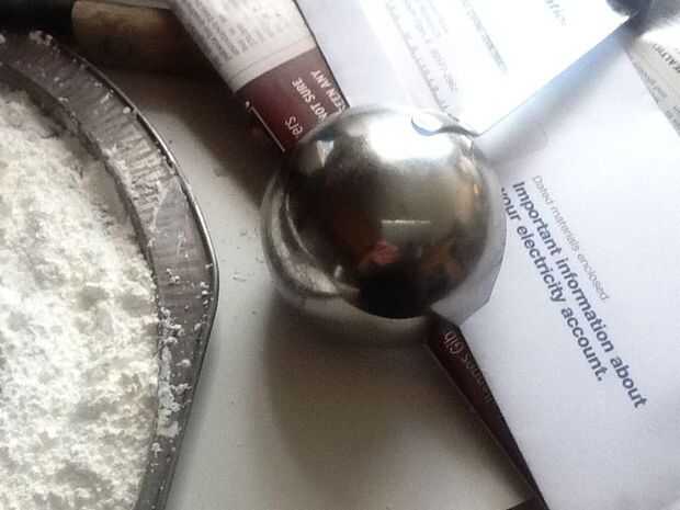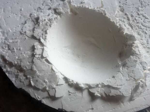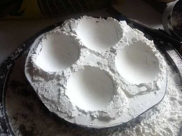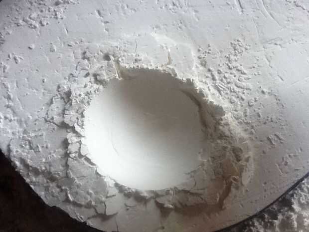 Tomar su objeto redondo - en mi caso, mi cucharón de dos pulgadas de diámetro y presionar en el almidón de maíz. Como un meteorito golpea la tierra, vas a desplazar mucho almidón, por lo que ordenará del montículo para arriba a los lados antes de dejar un cráter grande. La parte inferior del cráter probablemente va ser algo agrietada o tiene imperfecciones. No hay problema - simplemente girar el objeto esférico en el agujero para alisar hacia fuera. Que es la ventaja de hacer un molde del objeto redondo: que no tenga problema de desplazamiento grande como el instructivo aquí.