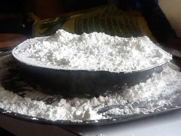 Tomar el pan de una pulgada profunda y llenar lleno de almidón de maíz. Mi particular pan es un pan de ocho pulgadas de diámetro, y llevaron dos cajas de 16 oz para llenarlo.