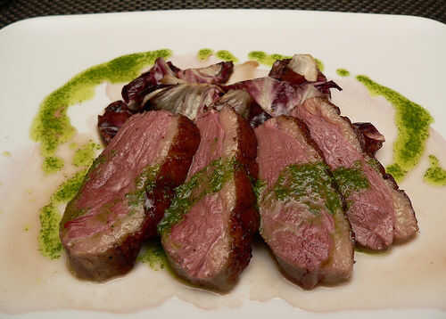 Corte la pechuga de pato diagonalmente a cada rebanada añadir algunos bok hoy mezcla 1/2 cucharada de vinagre balsámico envejecido. Vierte sobre la salsa de arándanos y añadir las patatas asado horno al lado del plato.