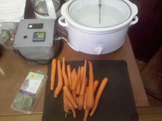 - No es necesario un completo sous vide instalación para cocinar las zanahorias, aunque lo hace más fácil. Las temperaturas para cocinar verduras sous vide no tan estrechas como lo es para la carne y puede utilizar esta técnica en la cocina con un buen termómetro y paciencia. Una olla barata probablemente trabajaría bien porque normalmente no consiguen lo suficientemente calientes como para hervir alimentos.