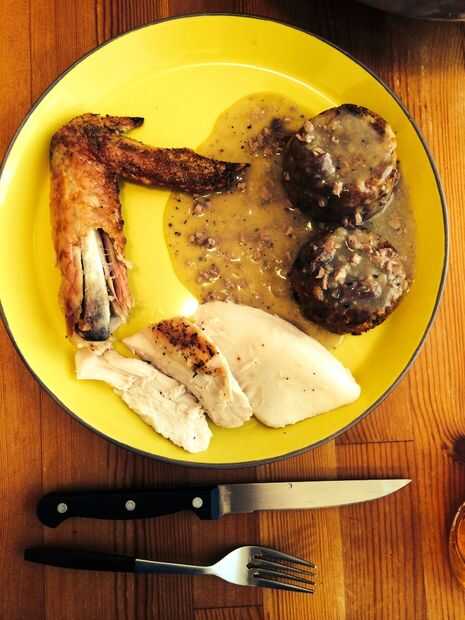 La manera que lo hago a menudo es simplemente apagar el horno después de una hora y dejarlo reposar allí 15 minutos mientras el horno se haya enfriado. Su pájaro no es todo bonito y stand-up como el proverbial pavo de acción de gracias, pero es mucho más fácil separar los muslos y las piernas y otras piezas cuando usted spatchcock. Serví minas con estos maravillosos Muffins Stuffin un Instructable me topé con y alguna salsa de menudillos. Resultó gran, y era forma spatchcock menos tiempo y esfuerzo hacerlo estilo.
