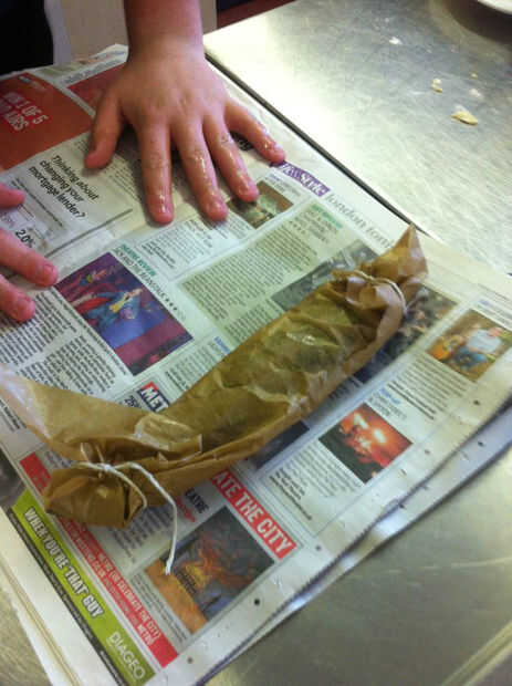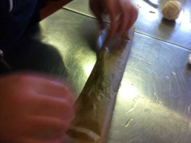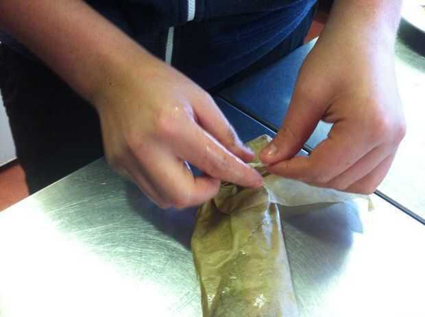 Pone el pescado en el papel de prueba de la grasa. Rodarla. Plegar los extremos y atar con una cuerda. No tienes que atar los extremos, pero deja los peces deslizándose hacia fuera.