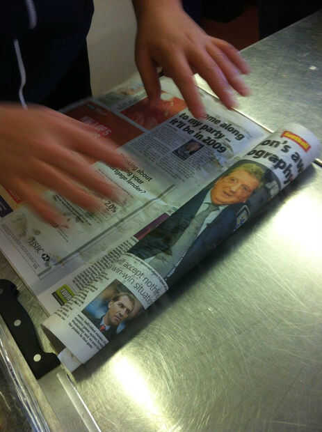 Usos del periódico, respetuoso del medio ambiente; Reutilizar el periódico. Escoba Eco Friendly y cubo de basura ecológico de los periódicos.