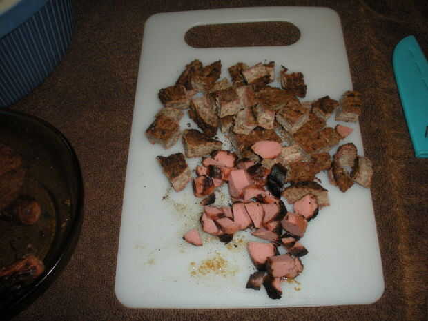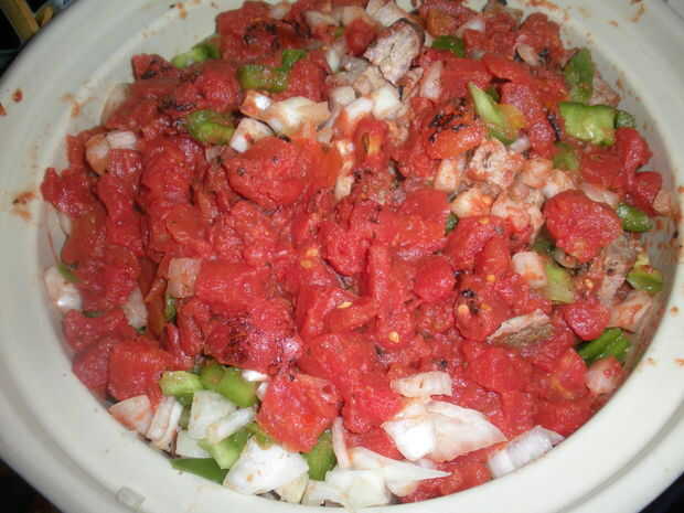 las cebollas y el pimiento tiene un pique rústico (piezas grandes), volcar todo en una olla, añadir la salsa de tomate, la mostaza y las latas de tomates en cuadritos y una lata de agua, añadir los demás ingredientes al gusto o usted podría utilizar una mezcla de chili o sloppy joe envasada. Cocinar en alto durante 1 hora y luego baja para 6-8 hrs