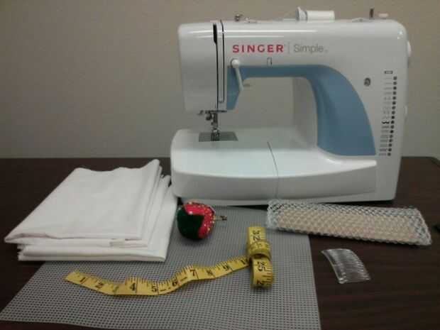 Se necesita 1 hoja de lona plástica, tijeras, retazos de tela, cinta, aguja e hilo, plancha, 2 claras, peinetas plásticas, velo del birdcage, de la red de medición (mina pedí de Amazon-el costo fue de $2,99 por yarda). También usé mi máquina de coser, pero este sombrero podría realizarse con una aguja e hilo.