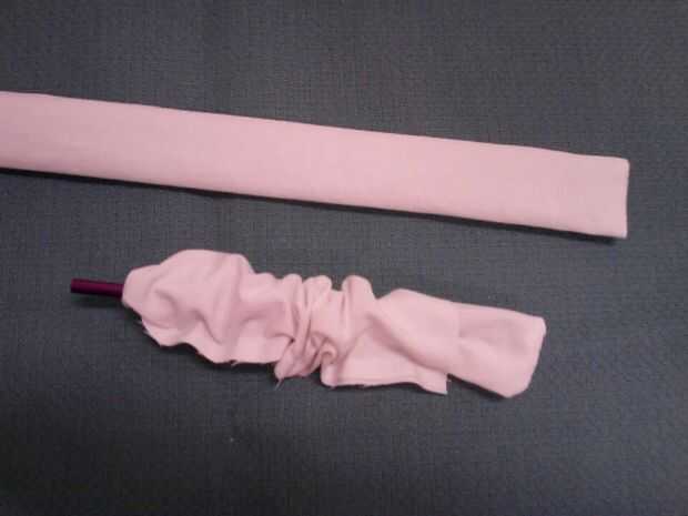 Corte 2 piezas de tela, 3-1/2 "x 14-1/2". Doblar cada uno por la mitad long-wise. Coser un extremo corto y hacia abajo el borde largo con costura de 1/4". Deje un extremo corto abierto. Gire a la derecha hacia fuera.