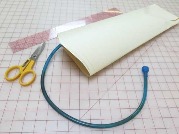 Para crear un carcaj que encajaría en mi pack de hidratación, me llena la bolsa con agua y utiliza cartón para crear una forma de tubo que se ajustan alrededor de él, dejando suficiente espacio en la parte superior para la tapa falsa y las flechas. He añadido una pieza para reforzar la aljaba en la parte inferior y una franja decorativa en la parte superior.