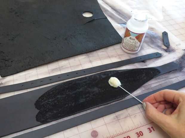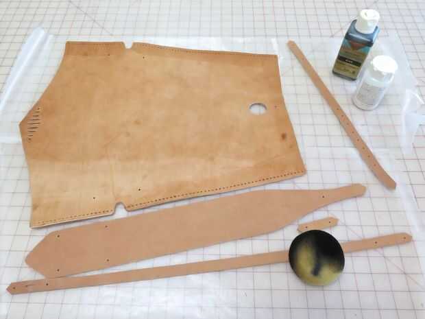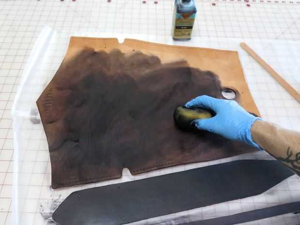 Esperé para que el cuero se seque y entonces mi patrón pedazos de papel encerado y teñido de ambos lados de la piel de verduras curtidas con Waterstain negro con una esponja.
