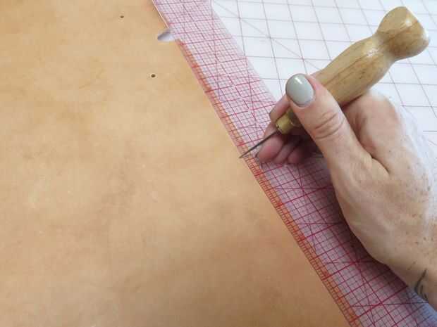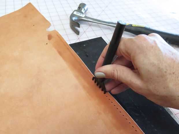 Antes de morir mi verdura curtida piezas de cuero trazó las líneas de costura con un punzón 1/4" en de los bordes a lo largo de la costura trasera. Luego moje el cuero a lo largo de los bordes con una esponja y había perforado los agujeros de costura con un golpe de la puntada y un martillo. Yo también perforado los agujeros para las hebillas de las correas pequeñas donde había marcado en mis patrones de