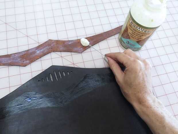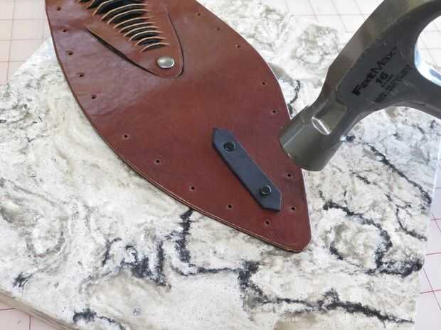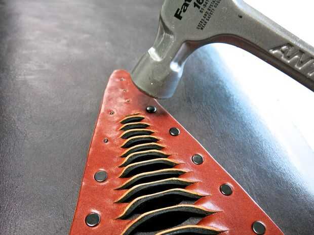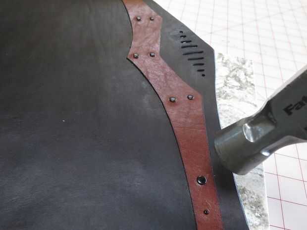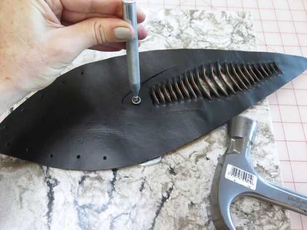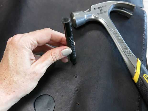 Luego utiliza una perforadora para hacer agujeros en el cuero negro y a las piezas entre si con remaches y un martillo.