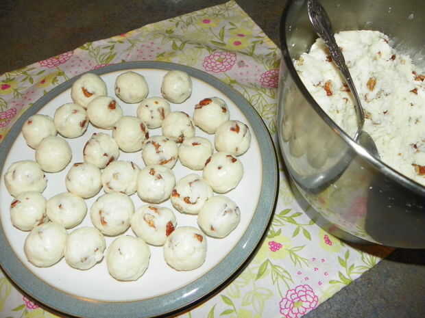 Forma bolitas de 1-1/2" o el tamaño de las nueces. Poner en un plato y colocar en la nevera durante una hora a endurecerse.