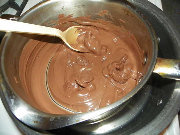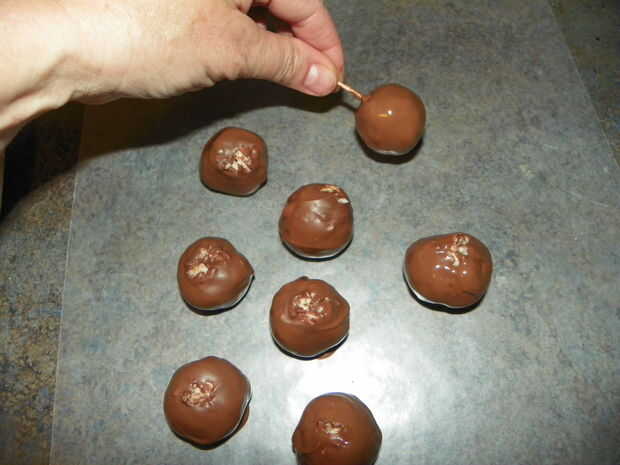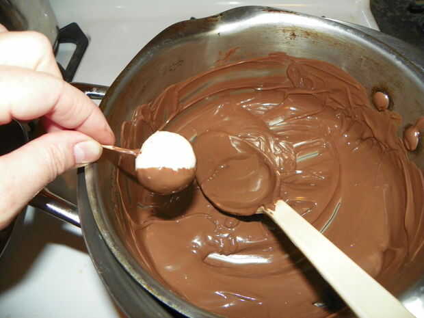 Derretir el chocolate en un baño María (o en lugar una olla pequeña dentro de una más grande y poner agua en el recipiente más grande.) Recoger cada pedazo de caramelo con un palillo de dientes, uno a la vez y sumergir en el chocolate derretido. Puede que necesite usar otro palillo de dientes para empujar la golosina el primer palillo de dientes. Colocar en papel encerado, permiten establecer. Si quieres fundir el chocolate blanco y salpicar sobre el caramelo, que añade un toque agradable, pero no suelen hacerlo.
