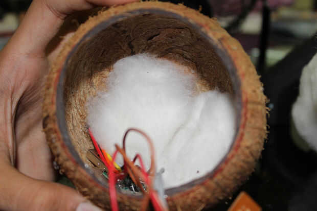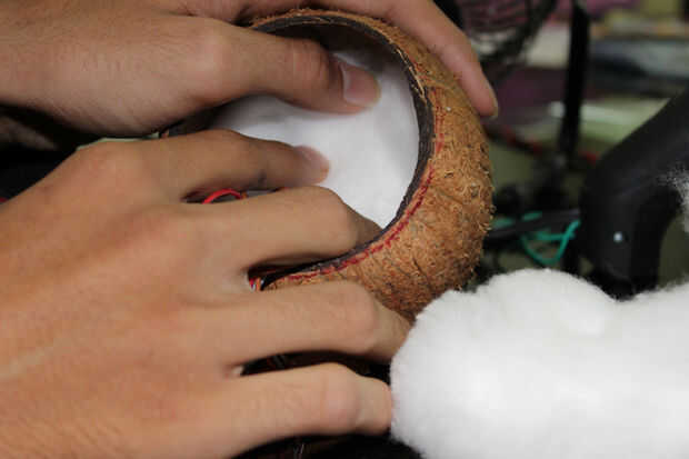 Utilizando un paquete de algodón médico o cualquier relleno de fibra absorbente de sonido la cáscara entera. Esta absorberá los ecos en el creado en la cáscara. Aunque el algodón tiene más bajos coeficientes de absorción acústica, funciona bien para este propósito.