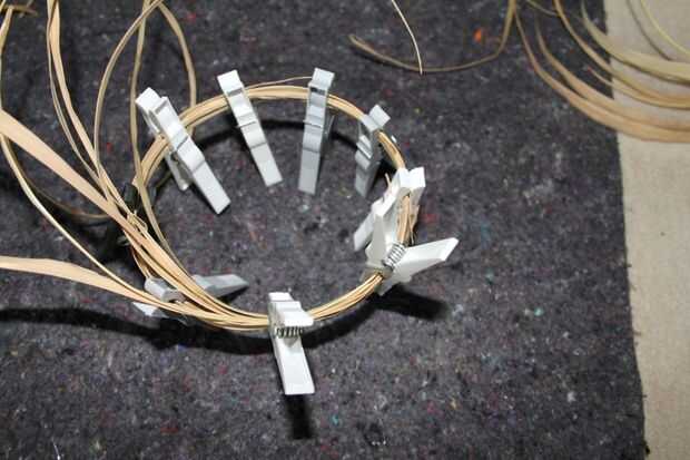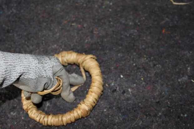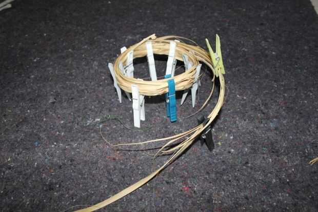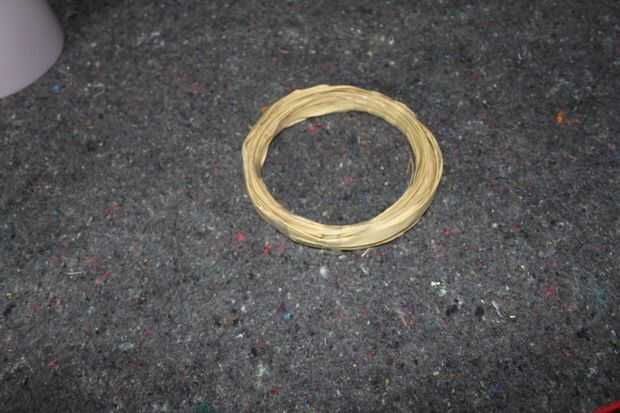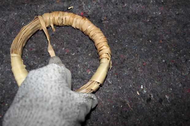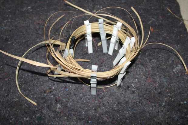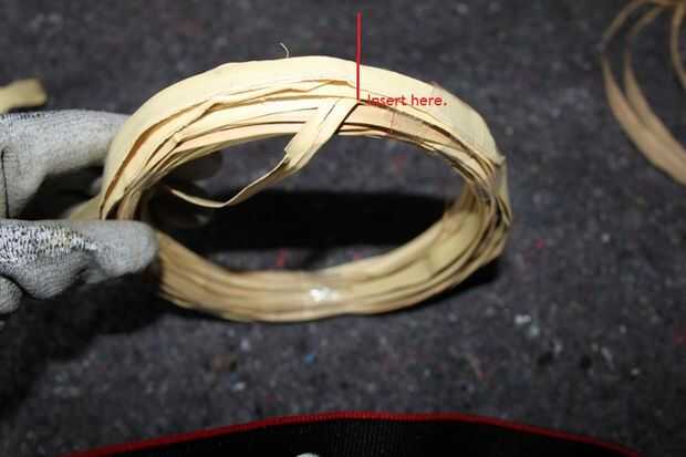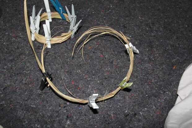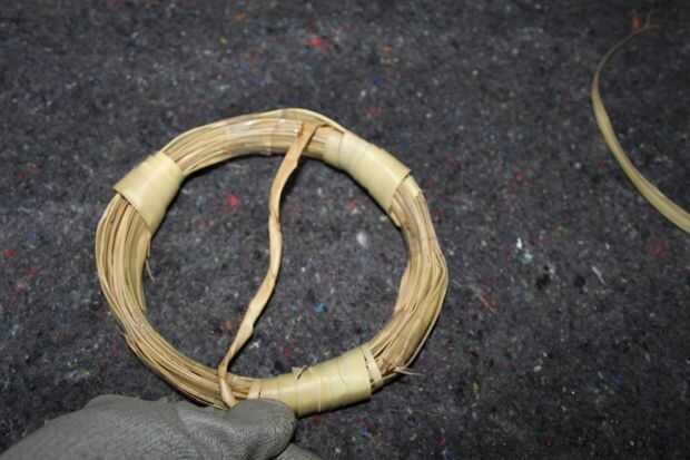 Doblé el heno dos poco a poco torcido izquierdo y derecho, (en algunos lugares se rompió ya era demasiado viejo y seco) cortar un punto de forma de V en un extremo e insertado entre el anillo de heno, véase cuadro 7 Inicio ahora envolviéndolo alrededor de poco a poco. Al final cortar un V e introducir hacia el interior muy bien. Esto tiene que hacerse con mucho cuidado porque es viejo y bien secos, por lo que se rompe.