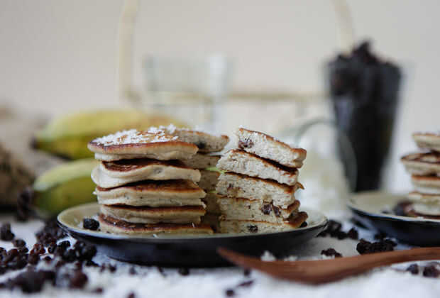 Pancakes de coco con pasas de uva (grano y Gluten libre, tuerca libre y leche gratis)