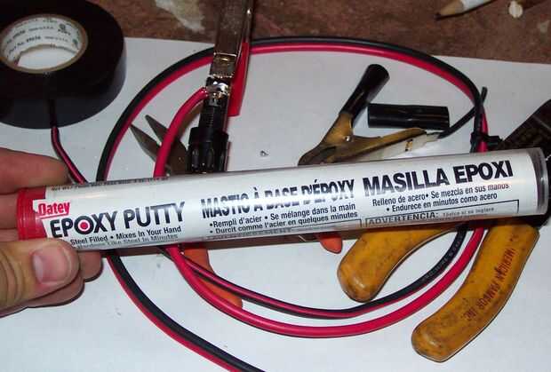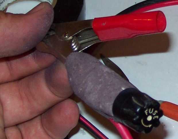 Esta es la parte de la novela.  Utilicé el arma secreta del hacedor #36--tuberías epoxi.   Home Depot tiene en la isla de plomería.  Esto es fantástico.  Ir a comprar un tubo de él ahora.  Es endurecedor de epoxy en el paquete.  Corte la cantidad que desea utilizar, amasa y luego la forma en la forma que desee.  Se pega al cristal y todo lo demás.  Puede ser perforado y presentado después de que endurezca.  Cortar aproximadamente 1.25" de las cosas del 3/4" tubo del diámetro para cada manija.  Luego lo formaron alrededor de la pinza y el portafusible para convertirlos en un conjunto sólido.  Es forma un agradable vínculo sólido y los portafusibles son uno con el mango después de cura en aproximadamente 5 minutos.