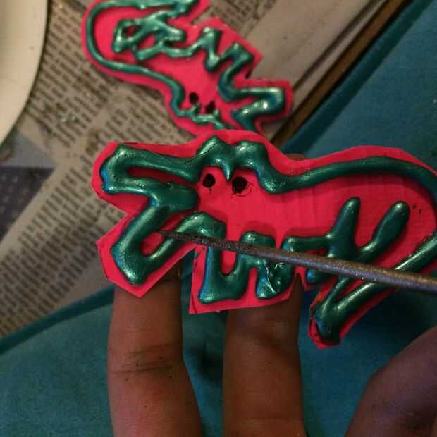 Empujar los agujeros en la cinta en el contorno de pegamento caliente de su forma.