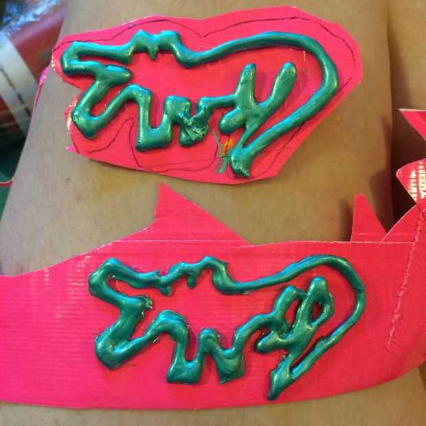 Usar su E6000 pegamento en cola tu pegamento caliente las piezas a su hoja de cinta de conducto.