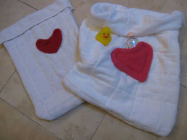 nada como un cocoon para bebé caliente después de un baño en una noche fría. Éstos utilizan una doble capa de toallas y extra grueso. He hecho dos tamaños aquí con uno de ellos un poco más fácil que el otro. Es una idea básica y simple con un montón de espacio para improvisar. Fácilmente podrían ser ajustado usando otros materiales suaves y blanditos, como un suéter viejo o mantas para bebés. Experimentar con diversas telas para otras opciones tanto como sea posible.
