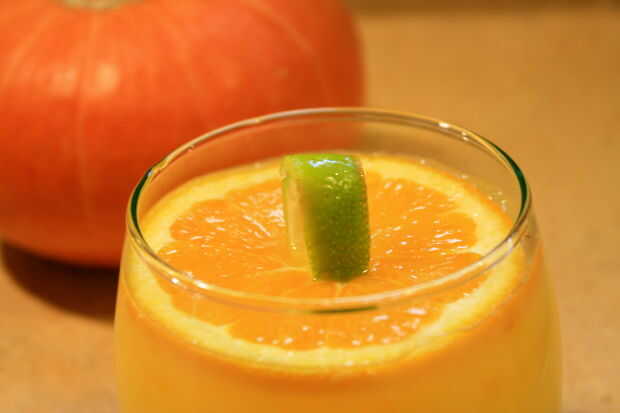 Vierta todo en un vaso rocas redondas llenado hasta la mitad con hielo. Rebanada y naranja el largo camino por lo que es una forma redonda. Cortar una rodaja de Lima y luego cortar la corteza con cuidado. Esa corteza de la curva por la mitad y coloque en el centro de tu naranja redondo. Suavemente Coloque el vaso encima del hielo, y hay un hermoso cóctel calabaza.