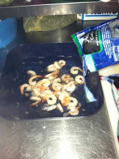 Vaciar las bolsas de camarones en un recipiente y enjuague con agua tibia para que descongele. Si tienen cola o piel sacarlos han descongelado totalmente hacia fuera.