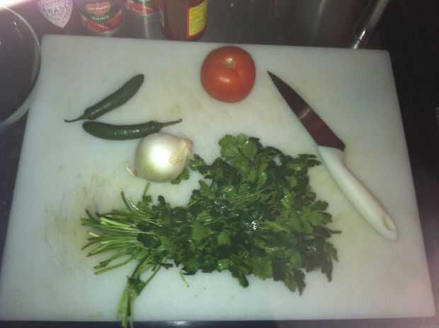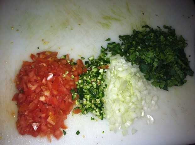 Cortar la cebolla, tomate y jalapeños en trocitos pequeños. Corte las hojas de cilantro a la mitad.