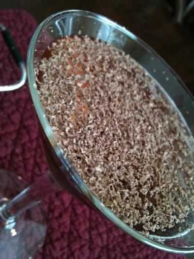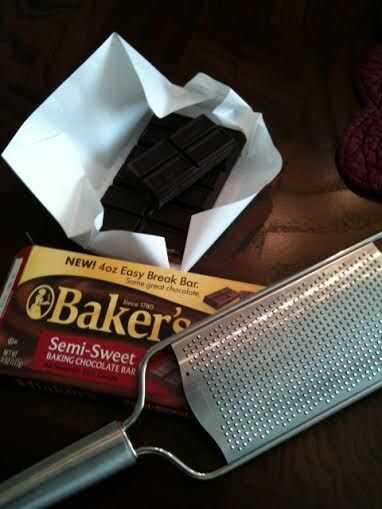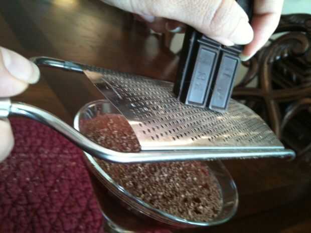 Romper un pedazo de su chocolate y raspar por el rallador de queso fino sobre su copa de cóctel para que una fina capa de polvo de chocolate cubre la superficie de su cóctel. Chocolate polvo puede volar alrededor de una broca como usted es la reja, pero es muy fácil de limpiar.