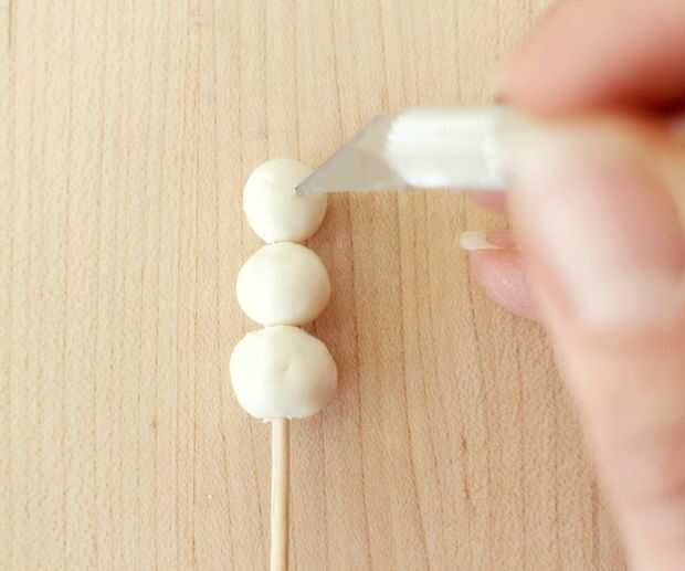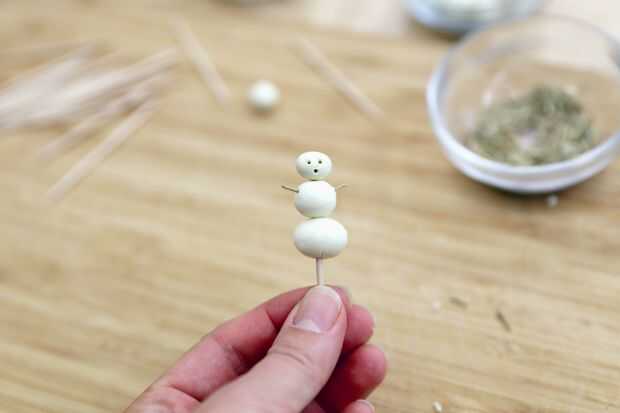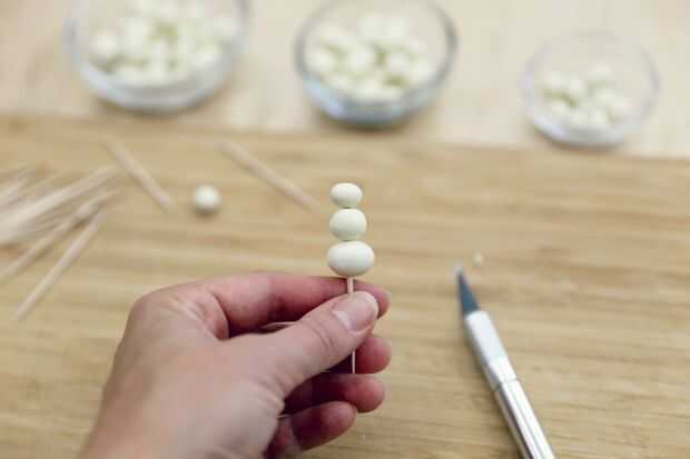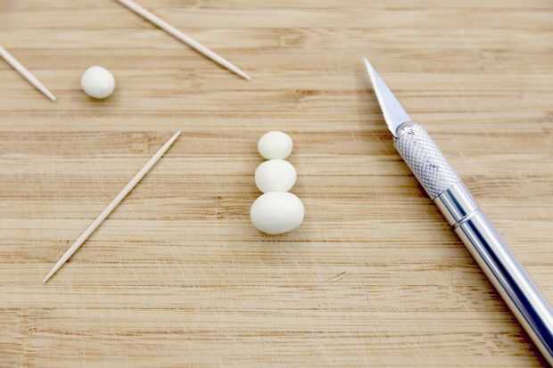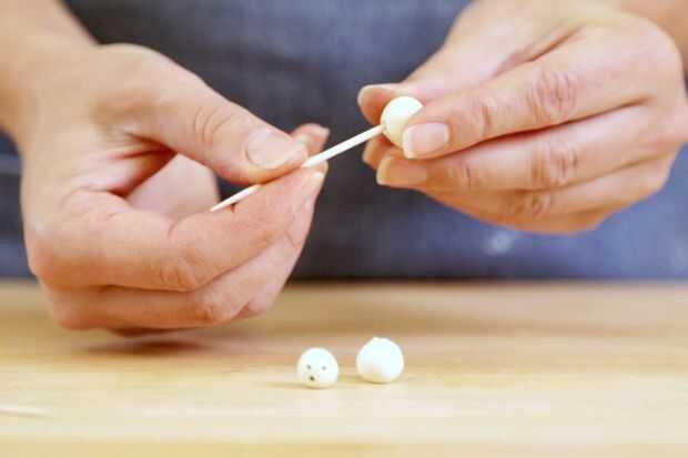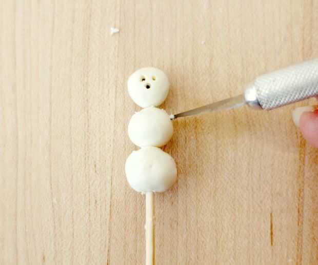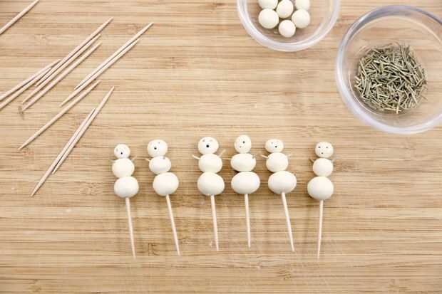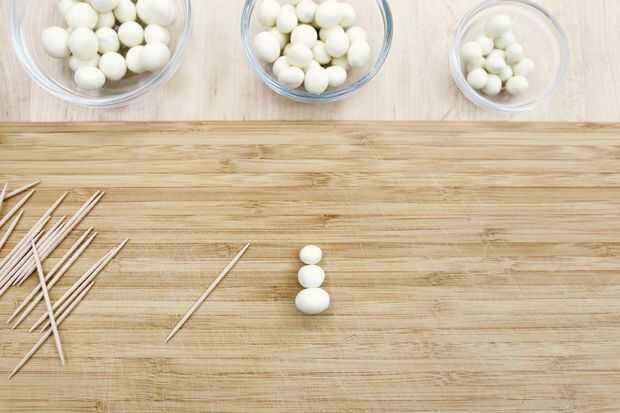 Deslice y twist la pasa abajo en el palillo de dientes. Repita lo anterior para la pasa media. Sólo hacer un agujero en la parte inferior de la superior pasa 'cabeza' y añadir a la parte superior de la pila. Asegúrese de que el palillo no sobresale de la parte superior.
