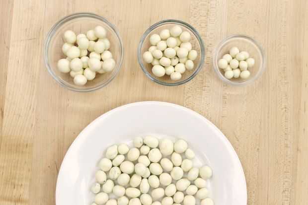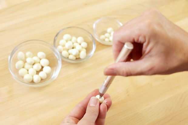 Especie a través del yogur cubierto pasas y escoger a los más pequeños, más redondo. Estos serán los jefes. Luego resolver dos ligeramente más grandes que aumentar de tamaño, que será las bolas medias y bajas.