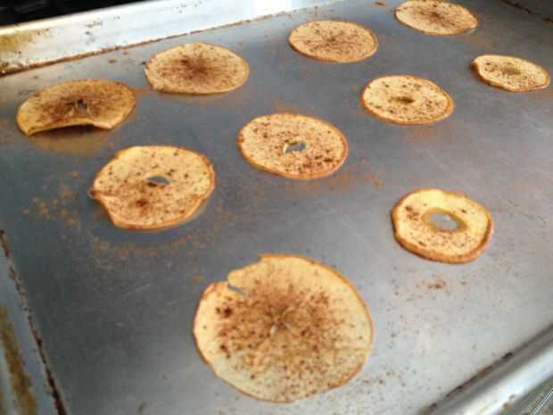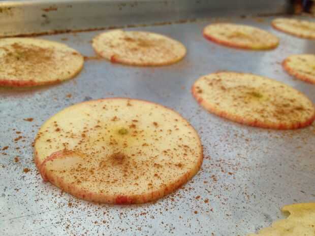 Precalentar el horno a 200 grados. Colocar las rodajas en una sola capa sobre una bandeja para hornear, espolvorear ligeramente con canela y luego hornee por 30 minutos. Después de 30 minutos las manzanas será algo seca y ligera que se pega a la sartén; cuidadosamente retire la bandeja que les Afloje para arriba (si no haces esto se muy pegadas a la sartén después de una hora) y se vuelve la bandeja al horno por 30 minutos.