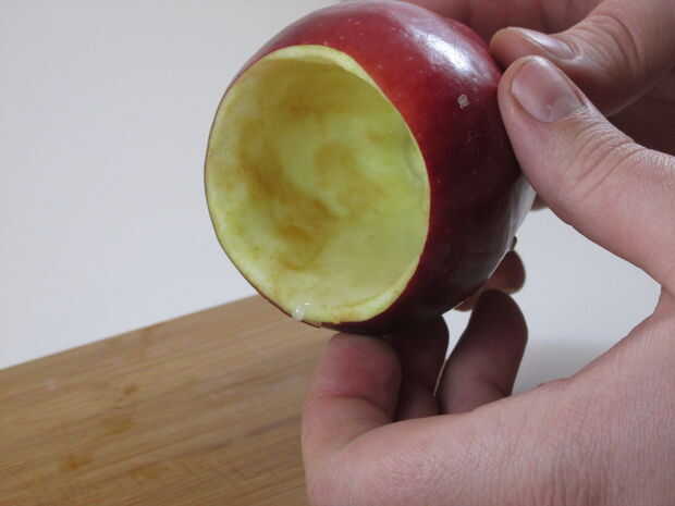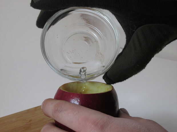 Capa la manzana con la cera de parafina sirve para dos propósitos, primero ayuda a impedir que la manzana da vuelta marrón y en segundo lugar crea una barrera de líquido para que tu tarta de manzana coctel no filtran a través del cristal y hacer un lío. Para cubrir su apple simplemente derretir la parafina a fuego lento en un recipiente seguro de calor y una vez que la cera es derretida Vierta en el hueco tallada en la manzana mientras que dan vuelta la manzana hasta cubrir toda la fruta expuesta. Una vez que estés feliz con tu capa de cera Deseche cualquier cera extra que queda y listo.