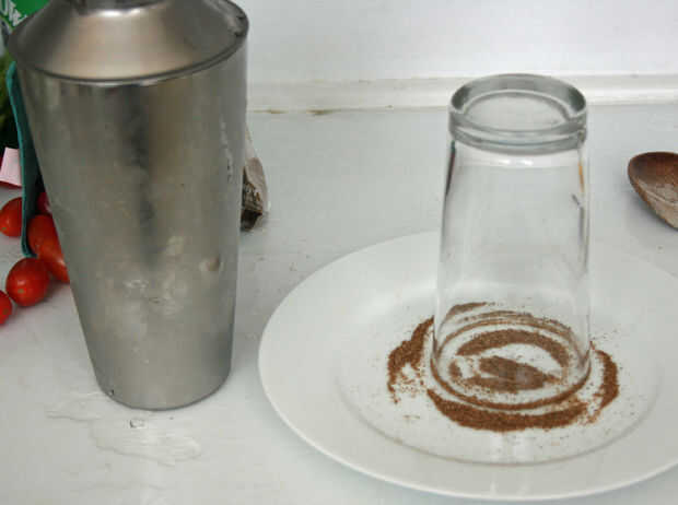 Frotar el borde del vaso con el jugo de limón y sumerge en un plato de sal de apio.