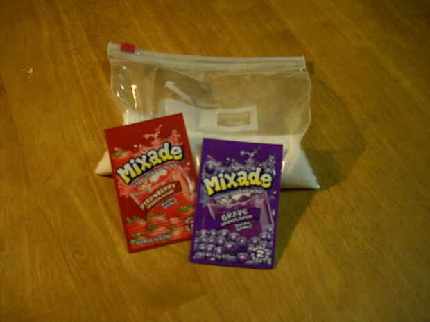 Recoger cualquier dos sabores de la mezcla de bebida en polvo.  Así como dos paquetes de bebidas, necesita una taza colmada de azúcar, una bolsa de plástico, jugo de limón y hielo.