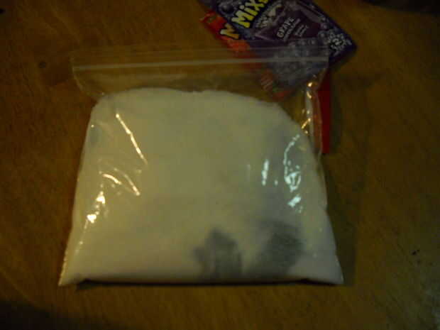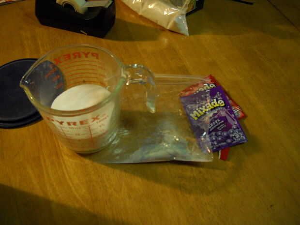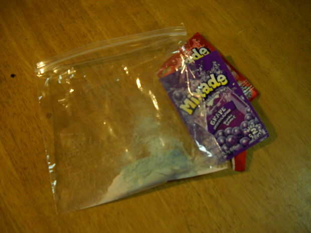 Añadir los dos paquetes de mezcla de bebida en polvo a una bolsa de plástico.  Añadir una taza colmada de azúcar.  Mezcle la bolsa hasta que no vea alguna mechas de color en el azúcar.