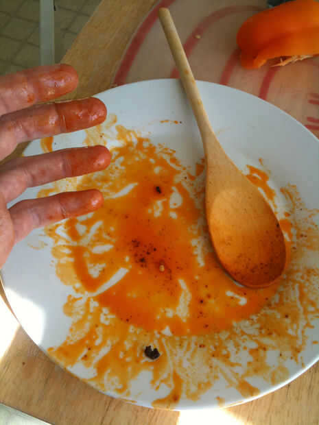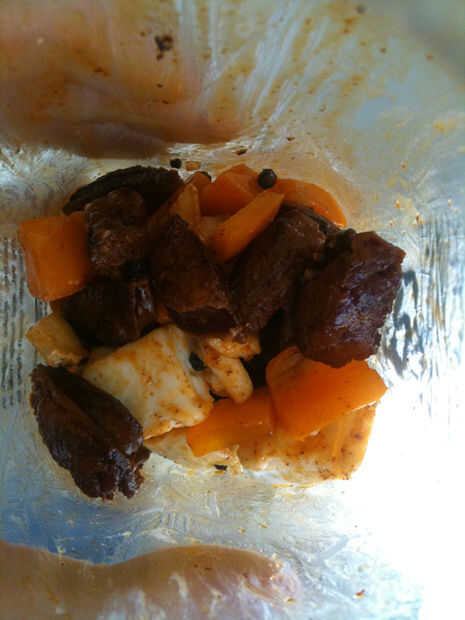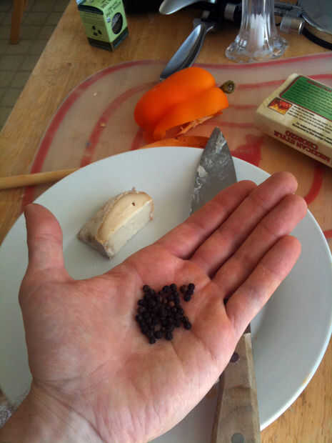 Traslado de la carne, la pimienta y el queso a una botella de vidrio. Tirar un puñado de granos de pimienta también.