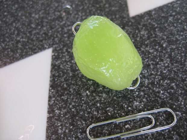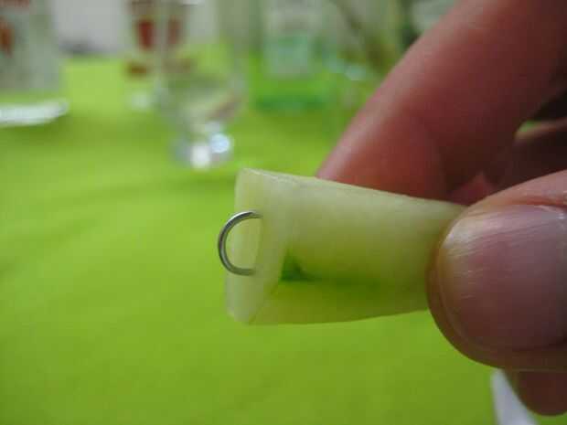 Los pepinos pueden ser cargados con clips de papel, como se muestra a continuación y sugeridos en el artículo de The New York Times, sin embargo he encontrado que simplemente colocando un pedazo de vidrio o de otro recipiente encima de la fruta para mantenerlo hacia abajo dentro de su baño de infusión de alcohol es mucho más fácil y más eficaz.