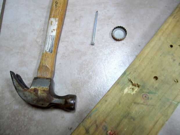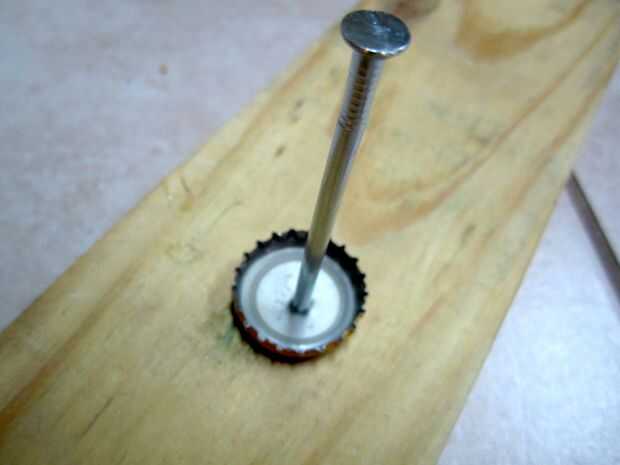 Utilice un clavo y un martillo en un bloque de madera para hacer un agujero en el centro de cada tapa de la botella. Asegúrese de que el agujero no es demasiado grande. Que desea ser apretado en tu pincho. Si está demasiado floja, se caerá en el líquido y podría atascarse al congelarse. (Hay muchas maneras de ir sobre esto, pero tuve algunas cápsulas ahí y encajan bien en la parte superior de mi vasos de chupito).