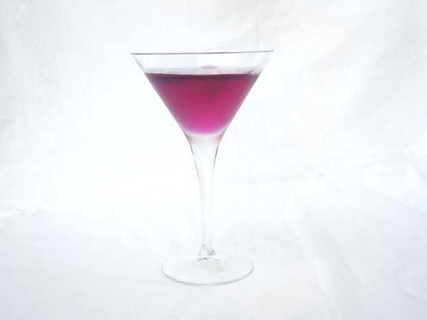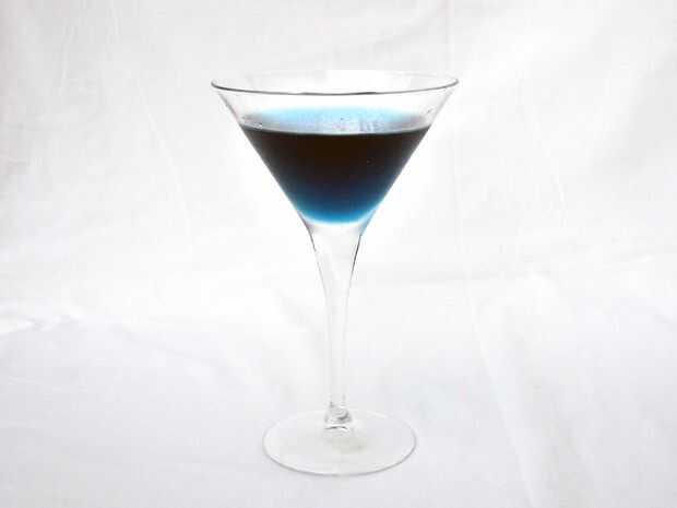 Medir dos onzas de Ginebra azul y una onza de jarabe. ¿Es el color de un bonito azul? Si es así, solo carga por delante. Si ha bordeado hacia el espectro púrpura con la adición del jarabe, puede que necesite agregar sólo una pizca de bicarbonato de sodio para empujar el pH hacia neutro. Otra vez, ir lento, asegúrese de no abusar del bicarbonato de sodio. Agite en una coctelera y servir en un vaso de martini.
