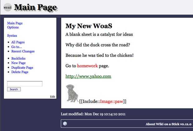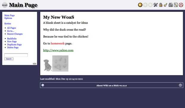 - Enlaces internos - para vincular a otra página, vaya al modo de edición y sólo poner el nombre de la página en dobles. Por ejemplo, para vincular a una página denominada "tarea", escribe [[tarea]], haga clic en el guardar icono, eso es todo.