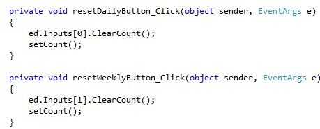 Entre los paréntesis escriben a "ed. Entradas [el número que se utilizó para su diario. CountLabel]. ClearCount(); ". Debajo luego escriba "setCount();" por lo que el dispositivo de ED sigue contando después de se ha restablecido. Hacer esto para su weeklyResetButton también.