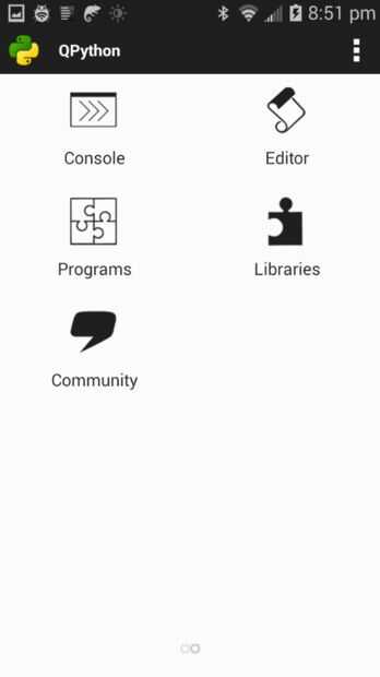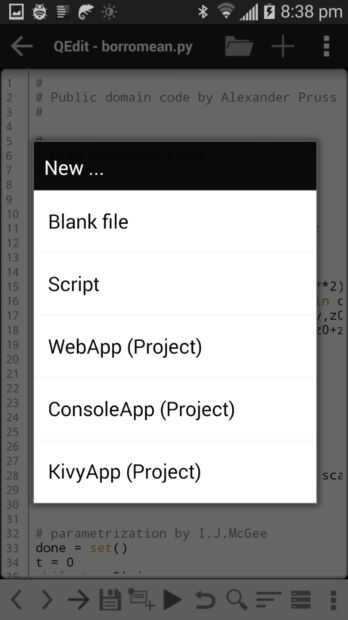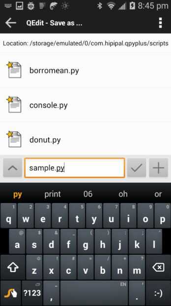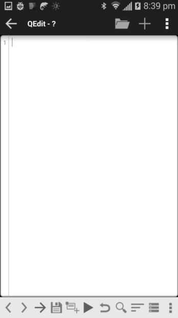 En la pantalla principal de QPython, pase a la derecha y elige "Editor". Presione el "+" botón en la esquina superior derecha y elija "Archivo en blanco".