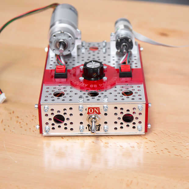 La idea es conectar un motor con encoder en y encendido. Inicialmente estará en modo de control de velocidad por lo que la gran perilla controla la velocidad y dirección del motor. Hasta ahora no terriblemente excitante... simplemente un controlador de velocidad con una entrada analógica. Pero puede utilizar el control de velocidad para el motor en la posición deseada para el primer punto final, presione el extremo de un botón, a continuación, entrar el motor en la posición que desea para el segundo punto final y presione el botón del extremo B y Bob es el hermano de su madre, que ahora está en modo de control de posición y el mando mueva el motor hacia adelante y hacia atrás proporcionalmente entre los extremos que ha configurado.
